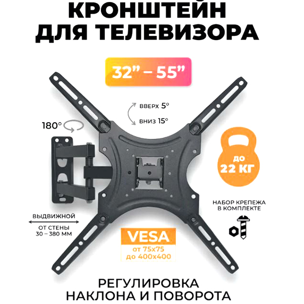 Надежная стальная конструкция. Легкий монтаж телевизора - благодаря наличию съемной монтажной пластины. Наклонно-поворотный черный.....